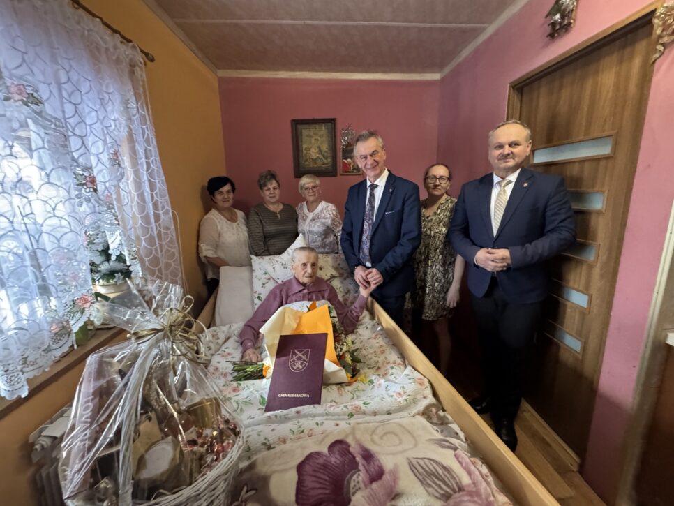 W odwiedziny do jubilatki przybył Wójt Gminy Limanowa, Jan Skrzekut. Towarzyszył mu Starosta Powiatu Limanowskiego, Mieczysław Uryga, który prywatnie jest synem pani Marii.
