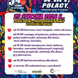 Przyłączamy się do Wielkiej Orkiestry Świątecznej Pomocy. 25 stycznia 2026 r. zapraszamy do Zespołu Szkolno‑Przedszkolnego w Modlnicy na 34. finał wydarzenia, które odbędzie się pod hasłem „A my, Polacy, pomaganie mamy w genach!”.