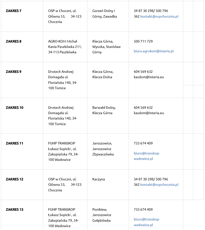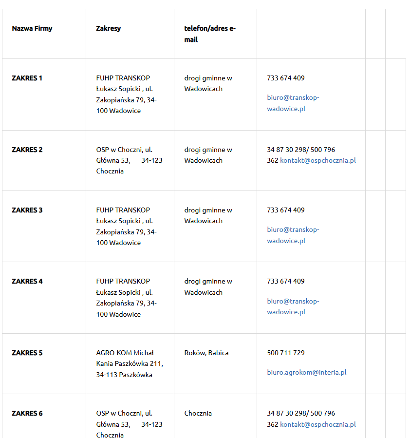 W praktyce oznacza to, że za poszczególne rejony odpowiadają m.in. FUHP Transkop, OSP w Choczni, Agro-Kom oraz Drotech. Do ich zadań należą odśnieżanie, posypywanie i interwencje w miejscach szczególnie niebezpiecznych: na wzniesieniach, zakrętach czy przy szkołach. Gmina zachęca kierowców, by w nagłych sytuacjach kontaktowali się bezpośrednio z wykonawcami, korzystając z opublikowanych numerów telefonów i adresów e-mail.