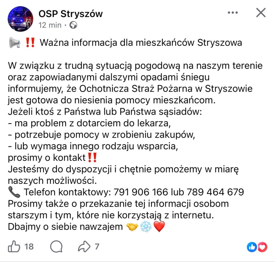 Druhowie apelują również o przekazanie tej informacji osobom, które nie korzystają z internetu, w szczególności seniorom. W komunikacie podano numery telefonów kontaktowych, pod którymi można zgłaszać potrzebę wsparcia. Strażacy podkreślają, że w obecnych warunkach solidarność i wzajemna troska są kluczowe, a szybka reakcja może realnie pomóc tym, którzy znaleźli się w trudnej sytuacji.