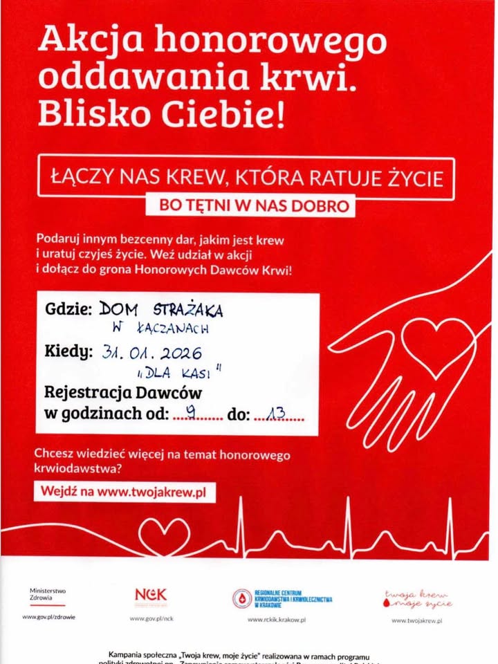 Akcja w Łączanach ma również wymiar symboliczny. Pokazuje, że lokalne społeczności potrafią się jednoczyć wokół ważnych spraw i reagować wtedy, gdy pomoc jest naprawdę potrzebna. Oddanie krwi nic nie kosztuje, a może stać się bezcennym darem dla drugiego człowieka. Organizatorzy liczą także na wsparcie informacyjne – udostępnienie wiadomości o wydarzeniu może sprawić, że dotrze ona do osób, które zdecydują się zostać dawcami. W takich sytuacjach nawet najmniejszy gest ma znaczenie.
