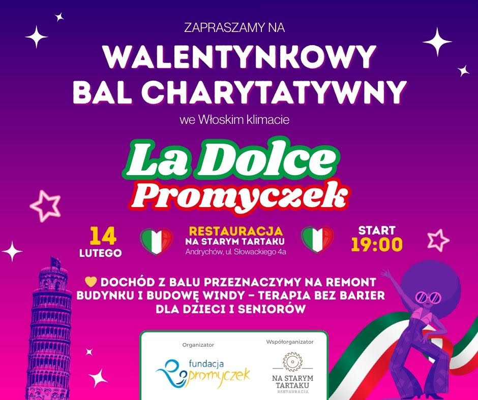 Fundacja „Promyczek” zaprasza mieszkańców regionu na wyjątkowy Bal Charytatywny „La Dolce Promyczek”, którego celem jest wsparcie utworzenia nowego, w pełni dostępnego miejsca terapii dla dzieci i seniorów. Dochód z wydarzenia zostanie przeznaczony na remont przestrzeni terapeutycznej oraz budowę windy, dzięki której podopieczni fundacji będą mogli korzystać z zajęć w bezpiecznych i godnych warunkach, bez barier architektonicznych.