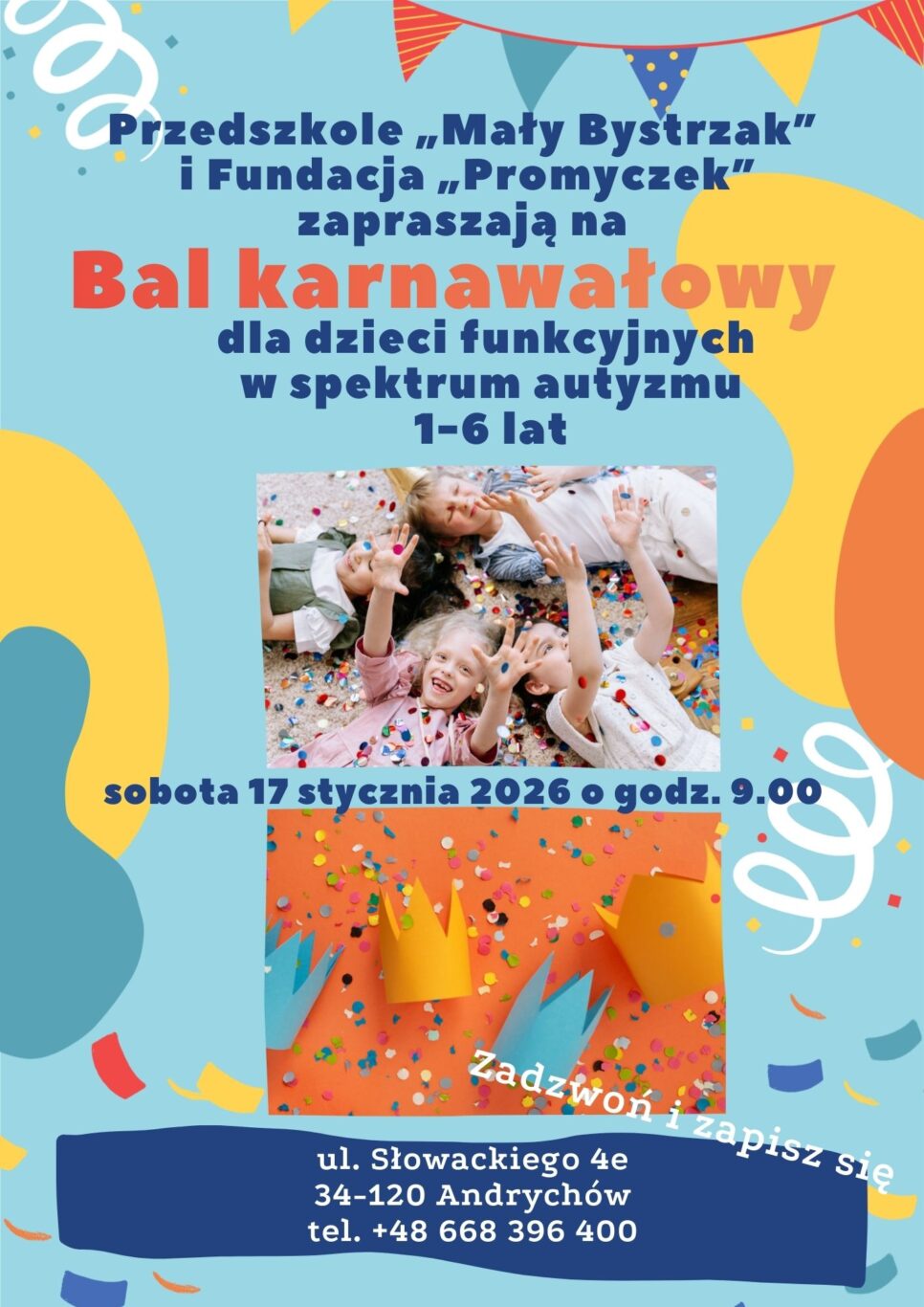 Bal odbędzie się w sobotę, 17 stycznia 2026 roku, o godzinie 9:00 w siedzibie placówki przy ulicy Słowackiego 4e w Andrychowie. Organizatorzy zapowiadają spokojną, bezpieczną przestrzeń do wspólnej zabawy, integracji i radości z karnawałowej atmosfery, dostosowaną do możliwości i wrażliwości uczestników.
