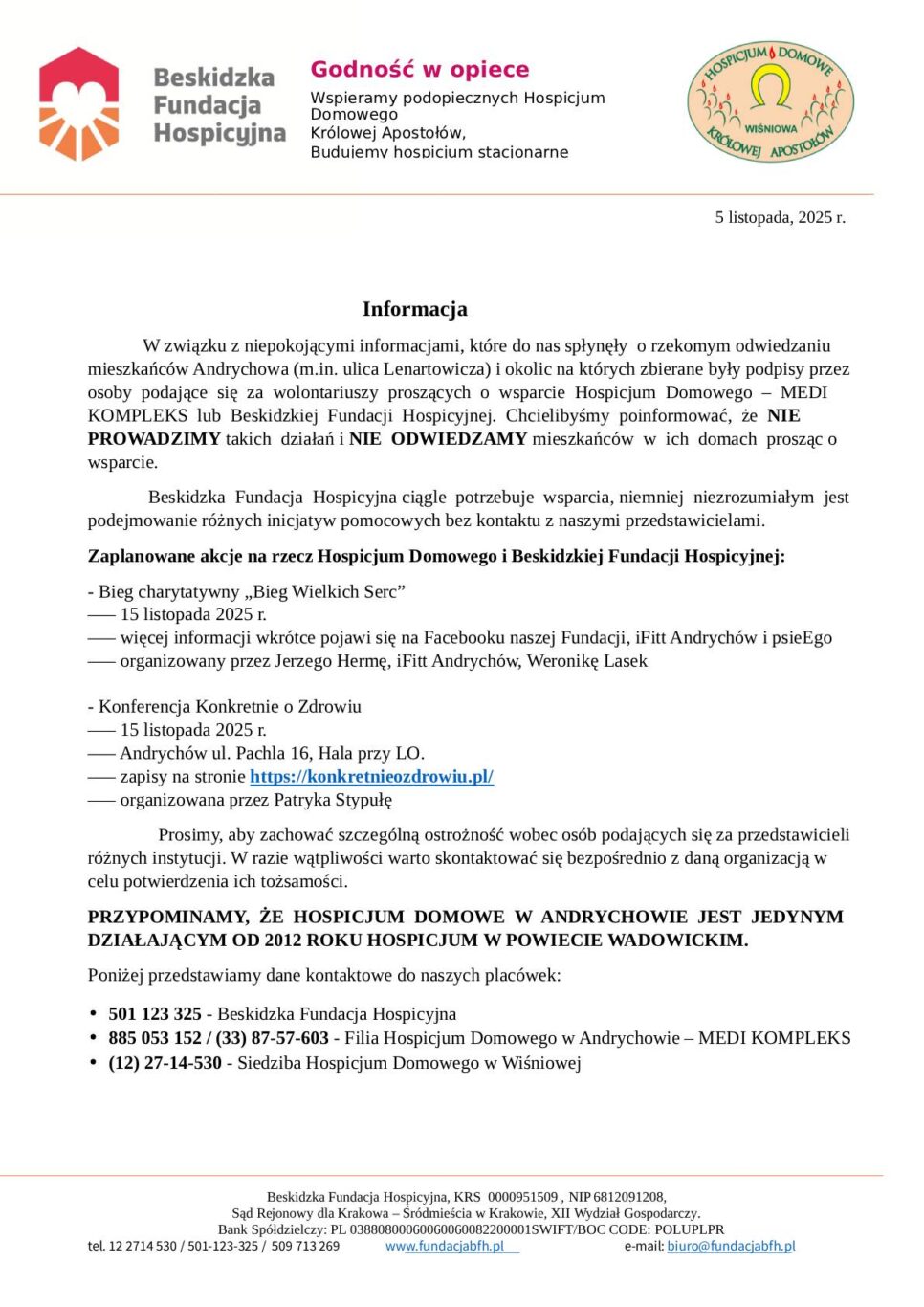 Fundacja apeluje o ostrożność i zachowanie czujności wobec osób podających się za jej przedstawicieli. W razie jakichkolwiek wątpliwości zaleca kontakt bezpośrednio z placówkami hospicyjnymi. Przypomina również, że Hospicjum Domowe w Andrychowie jest jedynym działającym od 2012 roku hospicjum w powiecie wadowickim.