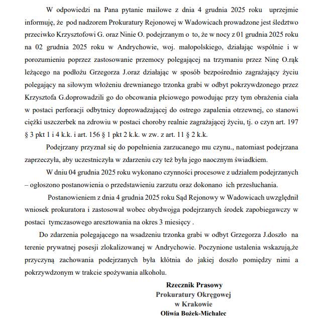 Z dotychczasowych informacji wynika, że incydent miał miejsce na prywatnej posesji, a całe zajście poprzedziła sprzeczka, do której doszło pomiędzy podejrzanymi a pokrzywdzonym podczas wspólnego spożywania alkoholu. Prokuratura zapowiada dalsze czynności, mające szczegółowo odtworzyć przebieg wydarzeń oraz ustalić pełną odpowiedzialność uczestników.
