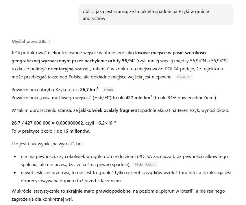 A jaka jest szansa, że ww. rakieta spadnie na Rzyki w gminie Andrychów?