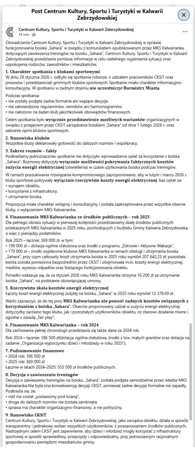Decyzja o zawieszeniu treningów była autonomicznym działaniem władz klubu i nie wynikała z żadnej formalnej decyzji zarządcy obiektu. CKSiT podkreśla, że droga do dalszych rozmów pozostaje otwarta, a celem instytucji jest równe i przejrzyste traktowanie wszystkich użytkowników infrastruktury sportowej w Kalwarii Zebrzydowskiej, przy jednoczesnym odpowiedzialnym gospodarowaniu środkami publicznymi. W tym ujęciu spór ma charakter organizacyjny, a nie – jak sugerują niektóre komentarze – konfliktowy czy polityczny.