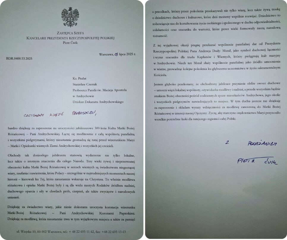 W liście podkreślono również, że jubileusz 300-lecia kultu Matki Bożej Różańcowej to wydarzenie nie tylko lokalne, ale o znaczeniu ogólnopolskim. Uroczystości miały wymiar duchowy i historyczny, a także stanowiły formę wdzięczności wobec przeszłych i współczesnych pokoleń wiernych z Andrychowa i okolic.