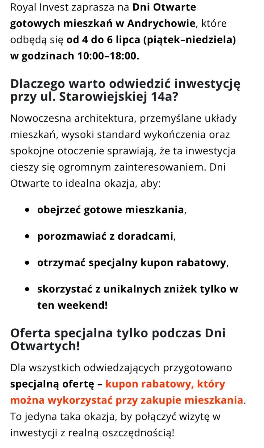 Organizatorzy podkreślają, że Apartamenty Starowiejska to propozycja dla osób poszukujących wygodnego mieszkania „od ręki”, bez długiego oczekiwania na zakończenie budowy. Dni otwarte potrwają do niedzieli i odbywają się przy ul. Starowiejskiej 14a w Andrychowie w godzinach 10:00–18:00.