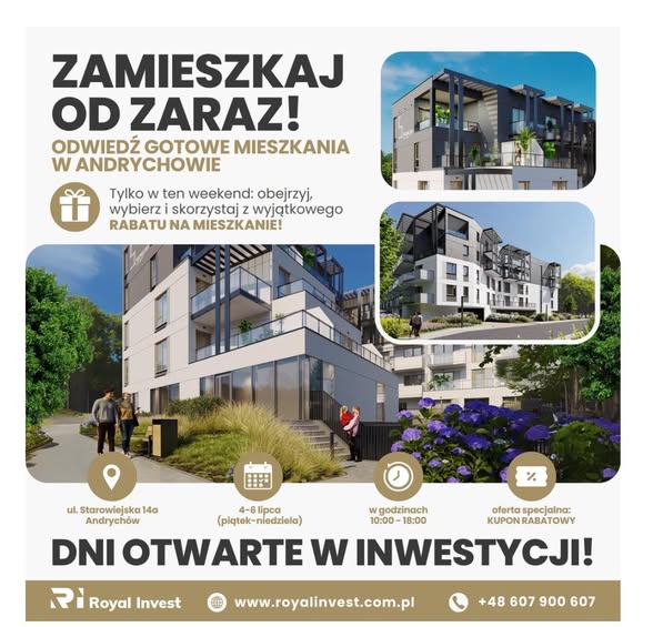 Na odwiedzających czekają mieszkania o powierzchniach od 26 do 87 m². To zarówno kompaktowe kawalerki, jak i większe, rodzinne apartamenty. Goście będą mogli porozmawiać z doradcami Royal Invest, którzy odpowiedzą na wszystkie pytania dotyczące oferty, finansowania zakupu i dostępnych terminów odbioru.
