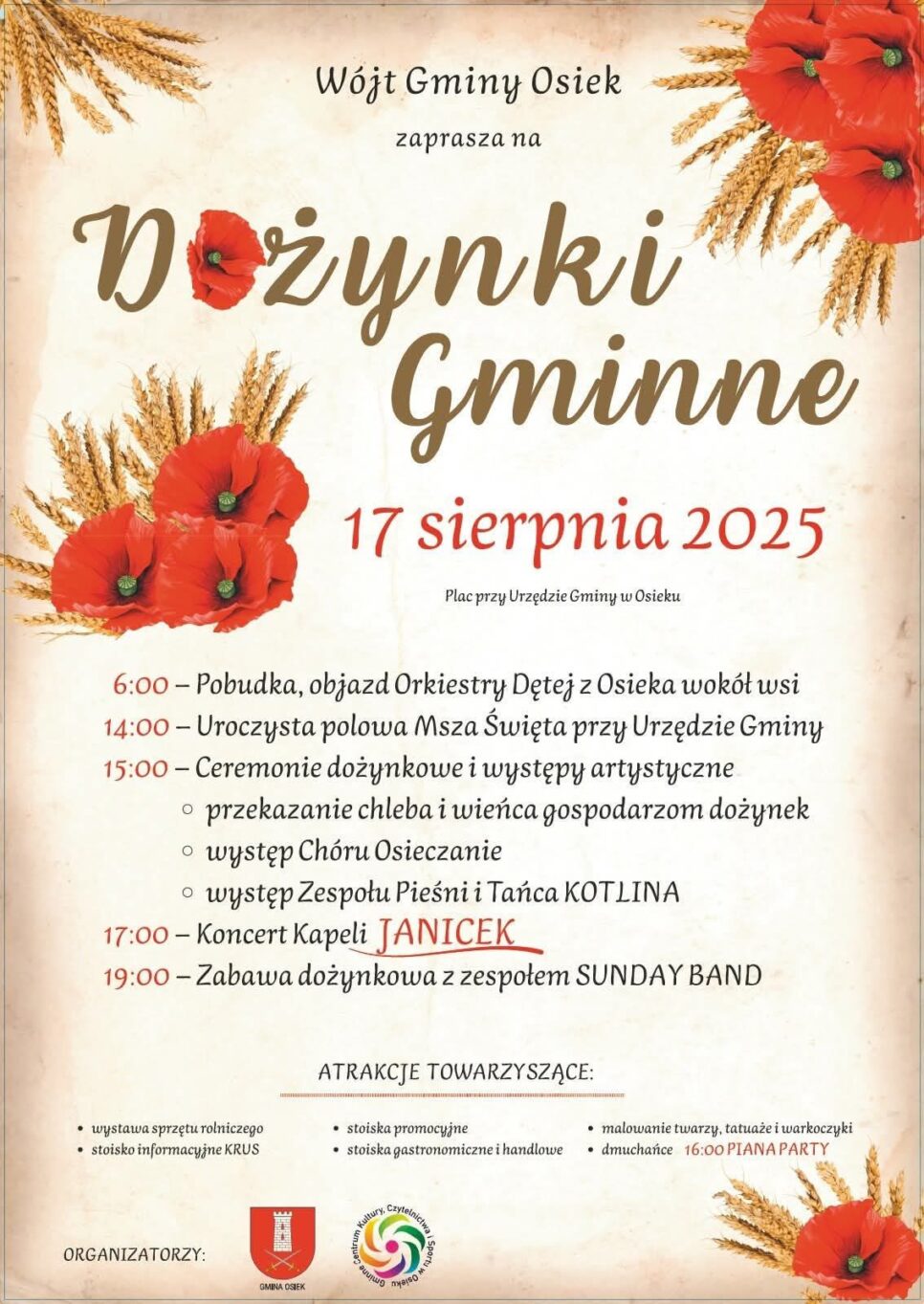 Zaraz po niej, od godziny 15:00, rozpoczną się ceremonie dożynkowe i występy artystyczne. Ważnym momentem będzie przekazanie chleba i wieńca gospodarzom święta, a następnie sceną zawładną lokalni artyści – Chór Osieczanie oraz Zespół Pieśni i Tańca Kotlin, prezentując barwny folklor i muzykę regionu.