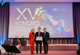 Podczas jubileuszowego XV Kongresu Polskiego Towarzystwa Lipidologicznego dr n. med. Konrad Stępień, związany zawodowo z Zakładem Chorób Zatorowo‑Zakrzepowych UJ CM i odbywający szkolenie specjalizacyjne w Oddziale Klinicznym Choroby Wieńcowej i Niewydolności Serca z Pododdziałem Intensywnego Nadzoru Kardiologicznego naszego szpitala, został uhonorowany nagrodą PoLA Young Investigators Award 2025. Wyróżnienie przyznano za najlepszą pracę dotyczącą zaburzeń lipidowych i miażdżycy opublikowaną w latach 2024–2025.