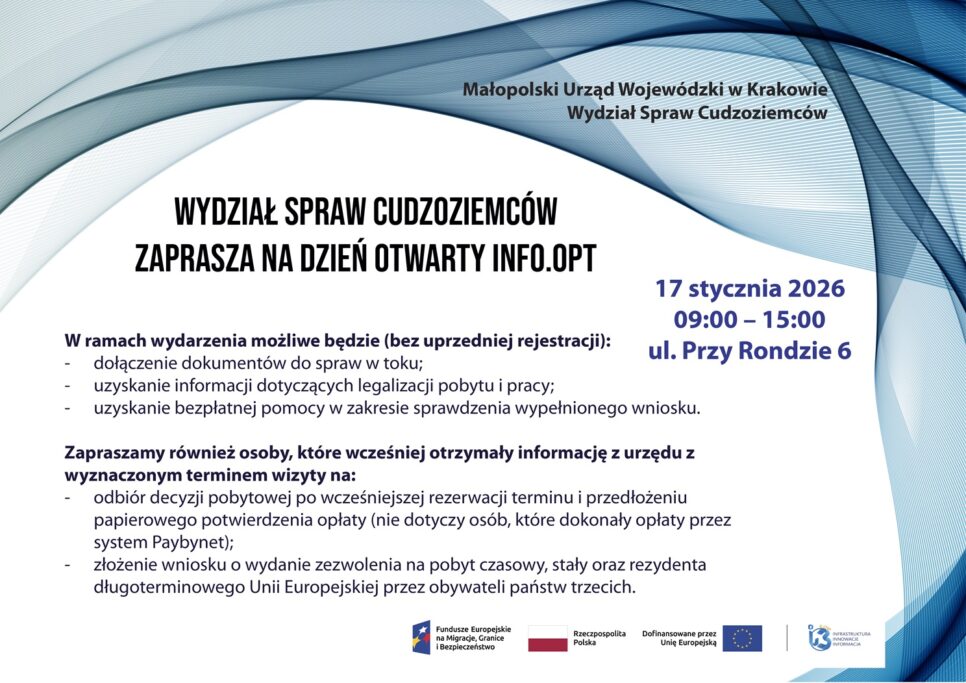 Wydział Spraw Cudzoziemców Małopolskiego Urzędu Wojewódzkiego w Krakowie organizuje „Dzień otwarty INFO.OPT”, który odbędzie się w sobotę 17 stycznia 2026 r. w godzinach 9:00–15:00. Spotkanie będzie miało miejsce w siedzibie Wydziału przy ul. Przy Rondzie 6 w Krakowie.