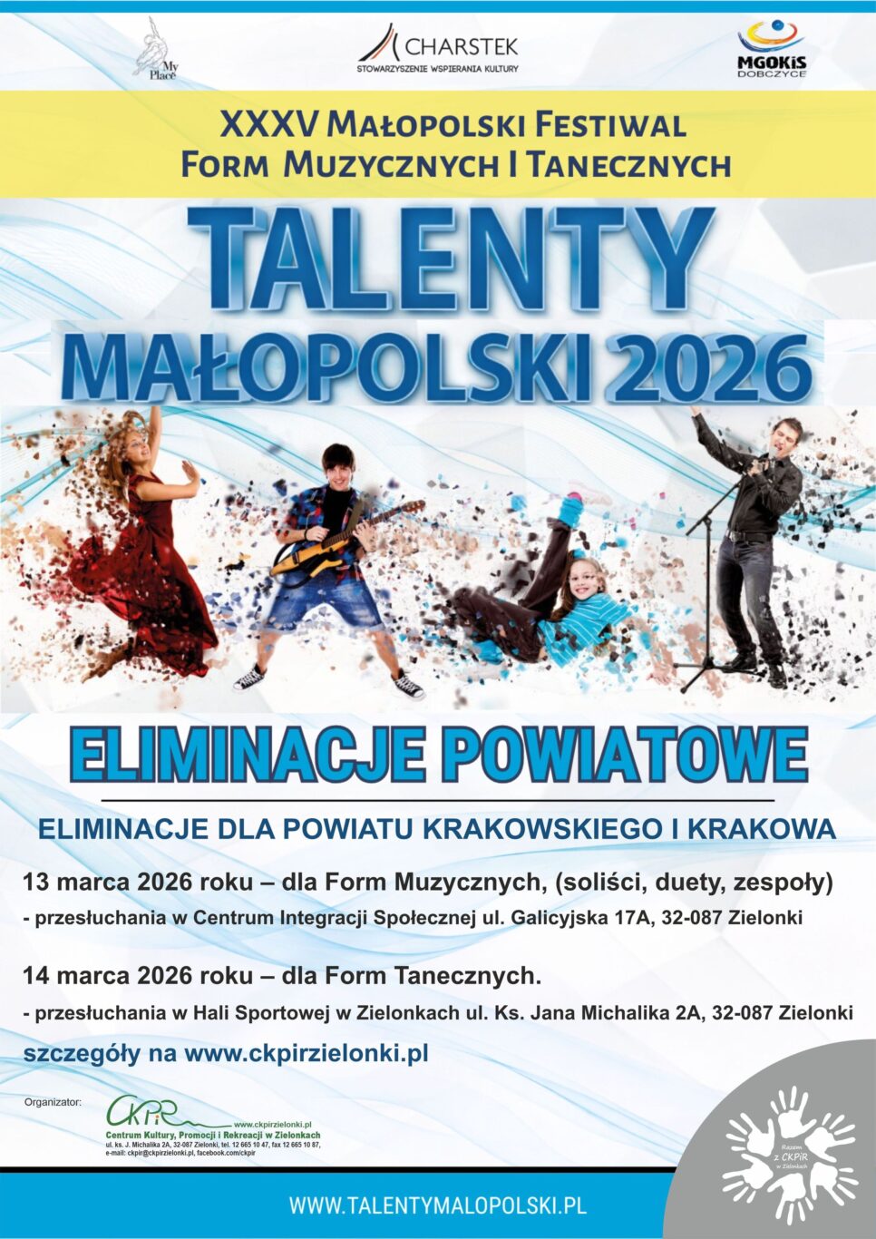 Formy taneczne: 14 marca 2026 (sobota) — przesłuchania odbędą się w Hali sportowej w Zielonkach, siedziba Centrum Kultury, Promocji i Rekreacji, ul. Księdza Jana Michalika 2a.