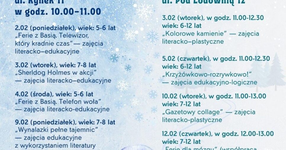 2.02 (poniedziałek), godz. 10:00–11:00, wiek: 5–6 lat — „Ferie z Basią. Telewizor, który kradnie czas” (zajęcia literacko‑edukacyjne)