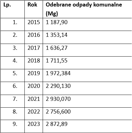 Dane gminy wskazują wyraźny wzrost masy odpadów od 2015 roku — łącznie wzrost przekracza 1,6 tys. ton rocznie. Najwięcej śmieci odnotowano w 2021 roku, kiedy to ilość przekroczyła 2 930 ton. Choć w kolejnych latach nastąpiły niewielkie spadki, ogólny poziom generowanych odpadów pozostaje wysoki.