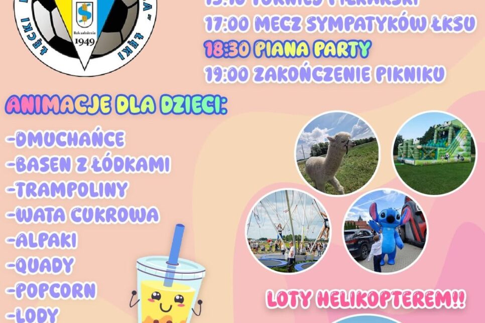 Na stadionie przy ulicy Sportowej 22 w Łękach rozpoczął się dziś o godzinie 13:00 Piknik Sportowy z Sołą Łęki. To wydarzenie, które przyciąga mieszkańców i gości, łącząc sportową rywalizację z rodzinną zabawą. Tuż po otwarciu ruszył turniej piłkarski, a o godzinie 17:00 zaplanowano mecz sympatyków ŁKS-u. Na uczestników czeka też wieczorna niespodzianka – o 18:30 […]