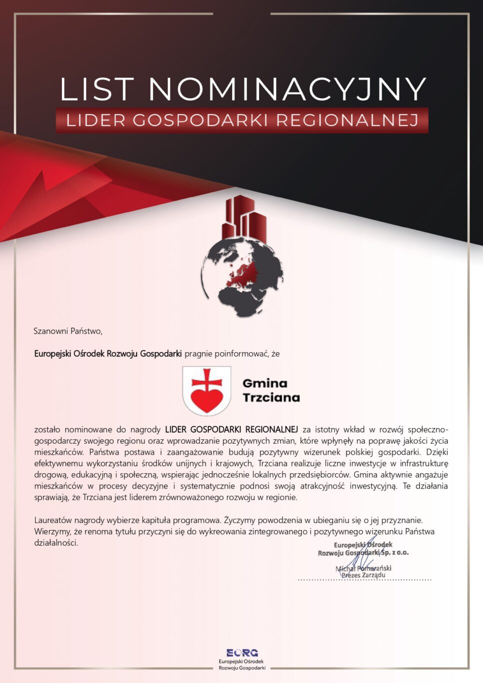Gmina Trzciana otrzymała nominację do prestiżowego wyróżnienia LIDER GOSPODARKI REGIONALNEJ za wkład w rozwój lokalnej gospodarki i poprawę jakości życia mieszkańców. Kapituła doceniła przede wszystkim działania samorządu, które przyczyniły się do pozytywnych przemian w regionie.