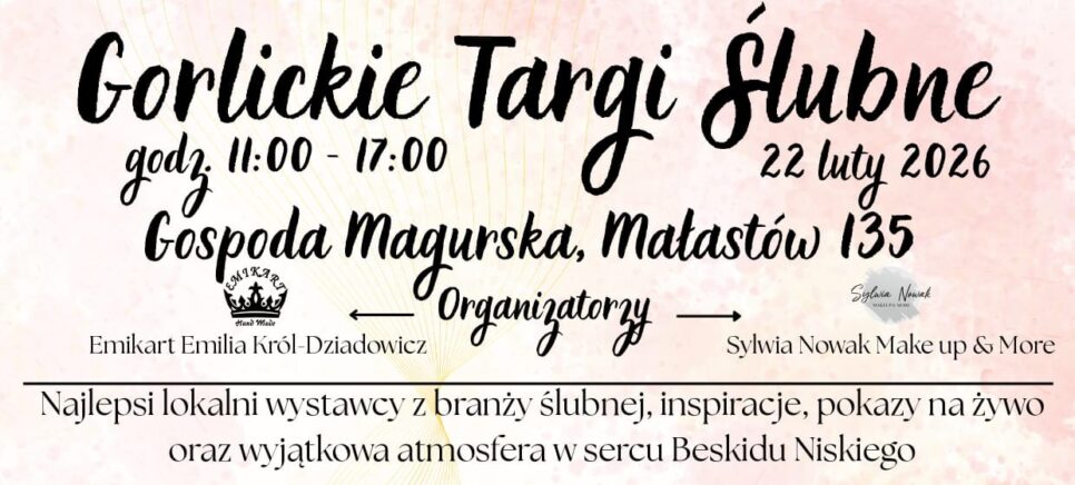 Planujesz ślub lub przyjęcie weselne? Szukasz inspiracji, profesjonalnego wsparcia i informacji o najnowszych trendach? Już 22 lutego w Gospodzie Magurskiej odbędą się Gorlickie Targi Ślubne, podczas których będzie można zapoznać się z ofertami lokalnych specjalistów oraz zobaczyć propozycje dekoracji, strojów i usług ślubnych. Wstęp jest wolny.
