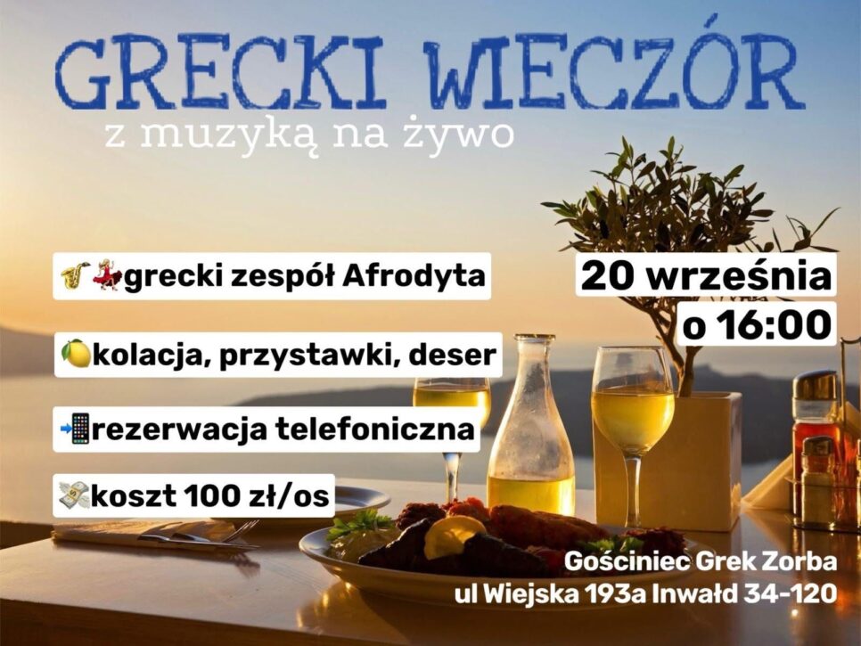 Na stołach pojawi się to, co w Grecji lubimy najbardziej: soczysty szaszłyk z opiekanymi ziemniakami, choriatiki w klasycznym wydaniu, kremowe tzatziki, a do przegryzienia oliwki oraz sery kefalotyri i mastello. Na finał – słodki deser „extra”, bo po takim menu nie wypada kończyć inaczej. W barze czekają napoje wyskokowe, a dla kierowców i młodszych gości soki BIO jabłkowe i pomarańczowe oraz dzbanki wody z cytryną i miętą.