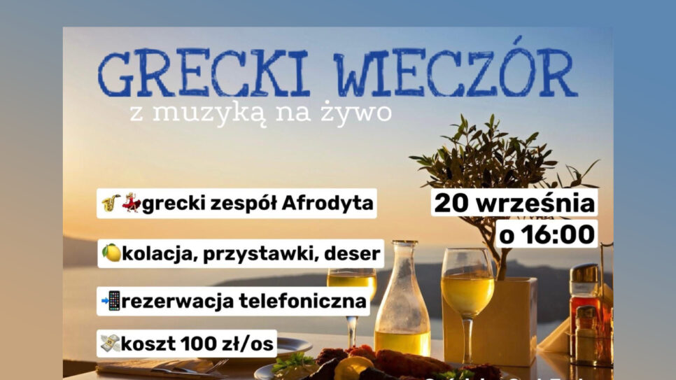 Na stołach pojawi się to, co w Grecji lubimy najbardziej: soczysty szaszłyk z opiekanymi ziemniakami, choriatiki w klasycznym wydaniu, kremowe tzatziki, a do przegryzienia oliwki oraz sery kefalotyri i mastello. Na finał – słodki deser „extra”, bo po takim menu nie wypada kończyć inaczej. W barze czekają napoje wyskokowe, a dla kierowców i młodszych gości soki BIO jabłkowe i pomarańczowe oraz dzbanki wody z cytryną i miętą.