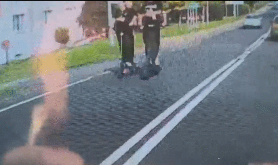 Na filmie wyraźnie widać co najmniej pięć osób poruszających się na trzech hulajnogach. Nie jadą pojedynczo, jak wymagają tego przepisy dotyczące poruszania się jednośladami, ale parami, zajmując znaczną część pasa jezdni. Co gorsza, przynajmniej jedna z hulajnóg przewozi dwie osoby i porusza się slalomem, jakby całkowicie ignorując panujące zasady bezpieczeństwa i zdrowy rozsądek.