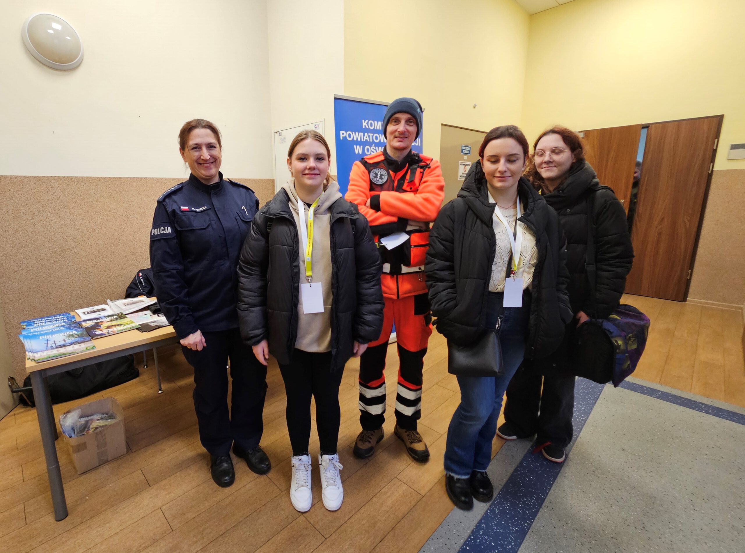 Podczas Mistrzostw uczestnicy odwiedzali również stoiska przygotowane przez służby ratownicze i mundurowe. Policjanci z Komendy Powiatowej Policji w Oświęcimiu, przygotowali stoisko profilaktyczno – promocyjne, na którym promowali zasady bezpieczeństwa oraz służbę w Policji. Młodzież zapoznawała się z zasadami rekrutacji do służby w Policji, policyjnym sprzętem służbowym oraz zadaniami realizowanymi na rzecz społeczeństwa. Wśród nich jednym z najważniejszych zadań, jest działanie na miejscach różnych zdarzeń oraz udzielanie pierwszej pomocy. Dla nauczycieli – opiekunów drużyn, policjanci przygotowali szkolenie, w ramach którego zaprezentowane zostały filmy profilaktyczne poruszające tematykę przemocy rówieśniczej, w tym cyberprzemocy oraz przemocy domowej. Omówili zasady przeciwdziałania, sposoby pomocy pokrzywdzonym oraz konsekwencje grożące sprawcom.