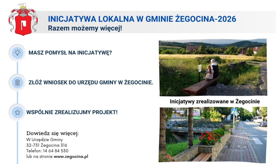 Mieszkańcy Gminy Żegocina mogą zgłaszać wnioski dotyczące realizacji zadań publicznych w ramach inicjatywy lokalnej. Zasady składania wniosków, tryb ich rozpatrywania oraz kryteria oceny zostały określone w odpowiedniej uchwale oraz w regulaminie opisującym szczegółowo procedury i wymagania.