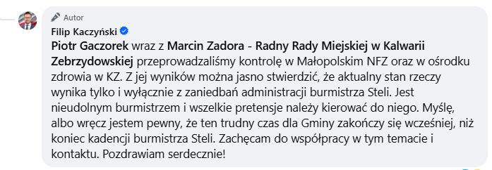 Filip Kaczyński, poseł z Wadowic z ramienia PiS, od dawna budzi w regionie silne emocje – w dużej mierze negatywne. Zarówno w Wadowicach, jak i w Kalwarii Zebrzydowskiej, w serwisie informacyjnym kalwaria24.pl pojawił się bardzo mocny, dosadny i szczery tekst autorstwa Andrzeja Famielca. [CAŁOŚĆ PRZECZYTASZ TUTAJ] nazwisko Kaczyńskiego coraz częściej pojawia się w kontekście politycznych rozgrywek, personalnych animozji i prób wpływania na lokalną scenę samorządową, oraz nieudolną próbą dzielenia społeczności lokalnej poprzez media społecznościowe. Najnowsza odsłona konfliktu to jego głośna wypowiedź dotycząca utraty nocnej i świątecznej opieki zdrowotnej w Kalwarii. Kaczyński wraz z radnym Marcinem Zadorą obwinił burmistrza Tadeusza Stelę o „zaniedbania” i „nieudolność”, sugerując, że obecny trudny okres dla gminy zakończy się jeszcze przed końcem kadencji włodarza.