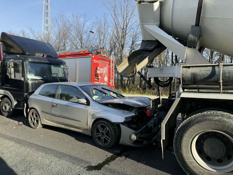 Samochód osobowy został zakleszczony pomiędzy dwiema ciężarówkami. Nikomu nic się nie stało. Na miejscu interweniuje straż pożarna