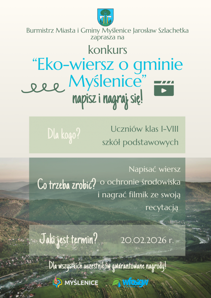 Burmistrz Miasta i Gminy Myślenice Jarosław Szlachetka zaprasza wszystkie dzieci z klas 1–8 szkół podstawowych z terenu gminy do udziału w ekologicznym konkursie poetyckim „Eko-wiersz o gminie Myślenice”. Celem inicjatywy jest rozwijanie świadomości ekologicznej oraz wrażliwości artystycznej młodych mieszkańców, a także promowanie aktywnego wypoczynku, ochrony środowiska i przyrodniczych atutów regionu Małopolska.