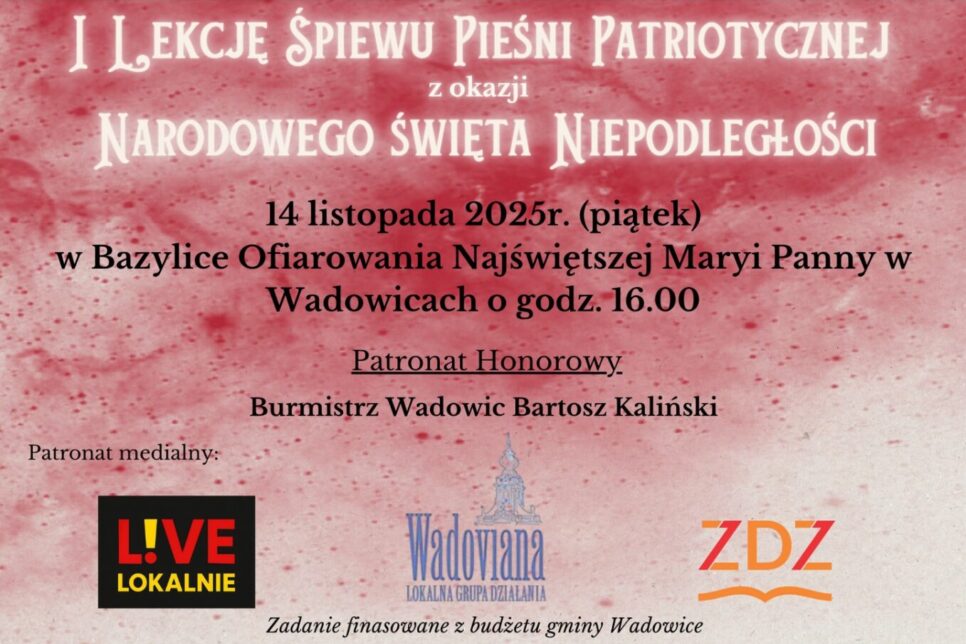 Stowarzyszenie Lokalna Grupa Działania „Wadoviana” zaprasza mieszkańców całego regionu na wyjątkowy koncert, który odbędzie się 14 listopada 2025 roku o godzinie 16:00 w Bazylice Ofiarowania Najświętszej Maryi Panny w Wadowicach. Wydarzenie nosi tytuł „I lekcja śpiewu Pieśni Patriotycznej” i ma być okazją do wspólnego przeżywania polskich tradycji oraz pielęgnowania lokalnej tożsamości. Pomysłodawczynią przedsięwzięcia jest Dorota […]