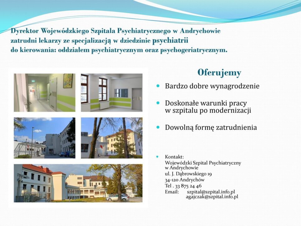 Placówka zaprasza do współpracy wszystkich, którzy chcą rozwijać się w nowoczesnym środowisku i dbać o zdrowie psychiczne pacjentów.