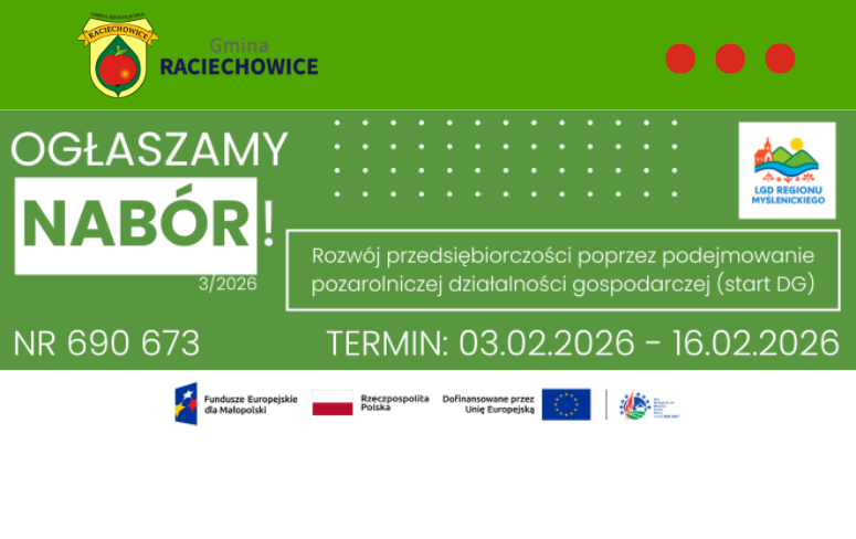 Lokalna Grupa Działania regionu Myślenickiego informuje o trwającym naborze wniosków w ramach Ogłoszenia nr 3/2026 dotyczącego „Rozwoju przedsiębiorczości poprzez podejmowanie pozarolniczej działalności gospodarczej – Start DG”.