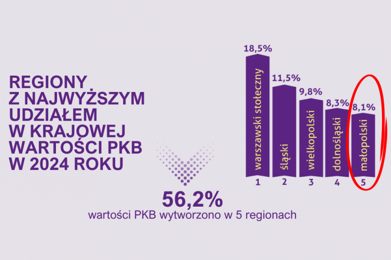 We wszystkich regionach Polski odnotowano w 2024 r. wzrost PKB w cenach bieżących w porównaniu z 2023 r. Największy udział w krajowym PKB miała Warszawa (18,5%), a najmniejszy region opolski (2,0%). Małopolska wygenerowała 8,1% krajowego PKB, co daje jej piąte miejsce w kraju; wartość PKB przypadająca na mieszkańca w województwie wyniosła 89,6% średniej krajowej.