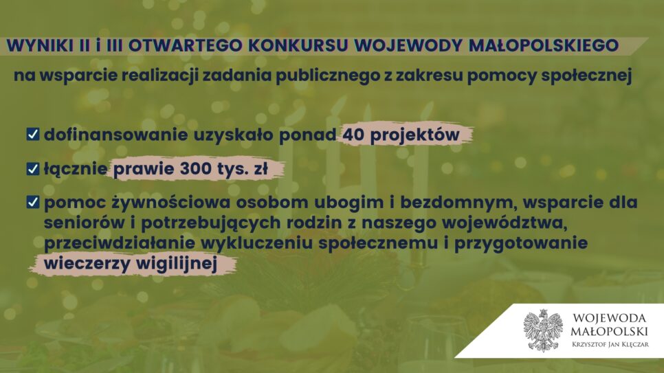 Projekty o symbolicznych nazwach takich jak „Boże Narodzenie czasem nadziei”, „Wigilijne Serce”, „Świąteczne dobro”, „Rodacy – Bohaterom. Pamiętamy o małopolskich Kombatantach. Boże Narodzenie 2025” czy „Wsparcie osób w trudnej sytuacji życiowej poprzez prowadzenie Misji Dworcowej i zorganizowanie spotkania wigilijnego” otrzymały wsparcie finansowe w ramach konkursów na zadania z zakresu pomocy społecznej. Konkursy te ogłosił wojewoda małopolski Krzysztof Jan Klęczar.