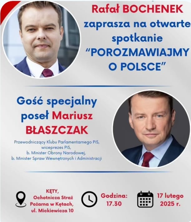 Spotkanie z Mariuszem Błaszczakiem zaplanowano na 17 lutego o godzinie 17:30 w remizie Ochotniczej Straży Pożarnej w Kętach. To kolejny przystanek w trasie polityków PiS, którzy mobilizują wyborców przed nadchodzącymi wyborami prezydenckimi. Można domniemać, że były wiceminister obrony i spraw wewnętrznych prawdopodobnie skupi się na kwestiach związanych z bezpieczeństwem kraju, polityką obronną i wewnętrzną oraz aktualnymi wyzwaniami, przed którymi stoi Polska.