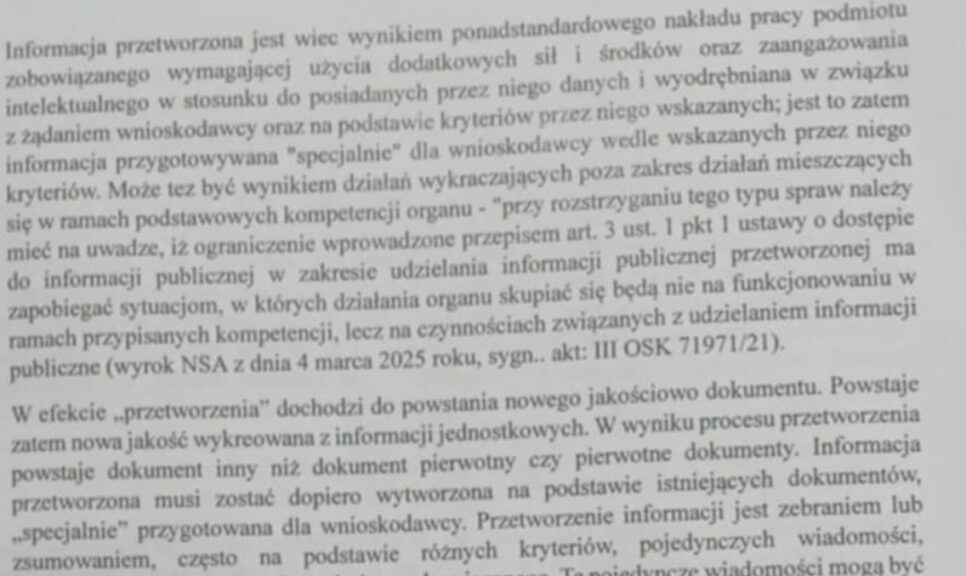 Sytuacja ta wywołuje pytania nie tylko o jawność wydatków publicznych, ale też o standardy obsługi obywateli w samorządach. Jeśli pytanie o koszty usług prawnych – opłacanych przecież z pieniędzy podatników – traktowane jest jak atak na urząd, a dostęp do danych uzależnia się od poziomu ich skomplikowania, to można odnieść wrażenie, że prawo do informacji staje się w praktyce iluzją.