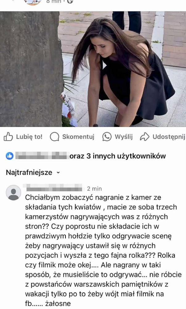 Autor komentarza uważa, że nie chodzi tu o uczczenie pamięci, ale o wizerunek. – „Nie róbcie z Powstania Warszawskiego letniej sceny promocyjnej tylko po to, żeby wójt miał co wrzucić na Facebooka” – pisze z oburzeniem.