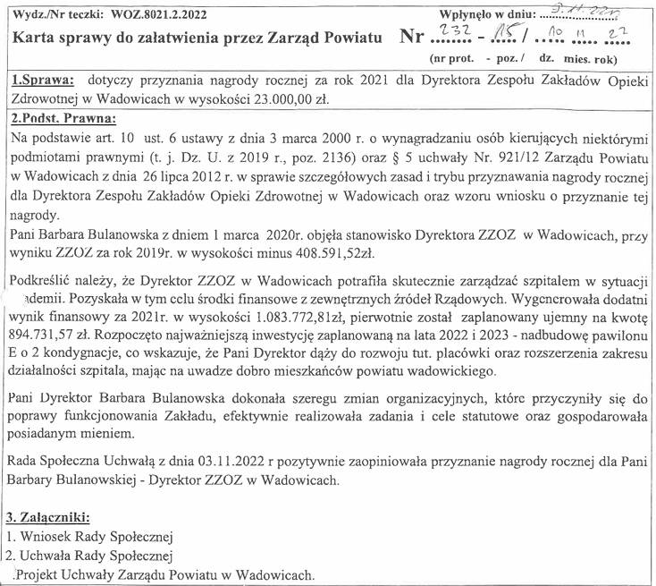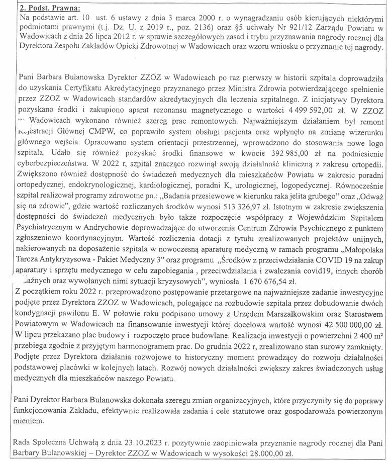 Za kulisami – nagrody dla dyrekcji, milczenie Rady Społecznej i coraz więcej pytań o skuteczność nadzoru. Strata rośnie w błyskawicznym tempie. Rok 2023 szpital zakończył stratą netto przekraczającą 3,7 miliona złotych. Już wtedy sytuacja finansowa powinna zapalić czerwone światło ostrzegawcze. Tymczasem zamiast poprawy – przyszło gwałtowne pogorszenie. W 2024 roku strata sięgnęła blisko 9,5 miliona złotych, ponad dwa i pół raza więcej niż rok wcześniej. Każdego dnia funkcjonowania ZZOZ generował więc dziesiątki tysięcy złotych deficytu. W trakcie posiedzeń Rady Społecznej ostrzegano przed rosnącymi kosztami wynagrodzeń, amortyzacją, nierozliczonymi nadwykonaniami i rozbieżnościami w danych kadrowych. Padały pytania o realność planu finansowego, ale na tym się kończyło – żadnych decyzji naprawczych, żadnych realnych konsekwencji. Powiat był zmuszony umarzać pożyczki przekraczające 2 mln zł, by ratować płynność jednostki. Nagrody mimo strat. Między 2020, a 2023 rokiem dyrektor szpitala Barbara Bulanowska otrzymała cztery nagrody roczne o łącznej wartości 88 tysięcy złotych brutto. Za 2020 rok – 12 tys. zł, za 2021 – 23 tys. zł, za 2022 – 28 tys. zł, a za 2023 – 25 tys. zł. Co ważne, wszystkie te nagrody przyznawał poprzedni Zarząd Powiatu Wadowickiego z Prawa i Sprawiedliwości, po uprzedniej pozytywnej opinii Rady Społecznej. Decyzje o nagrodach zapadały w czasie, gdy szpital już tonął w stratach, borykał się z nierozliczonymi nadwykonaniami, a Powiat Wadowicki był zmuszony dokapitalizowywać jednostkę oraz umarzać jej pożyczki. To rodzi podstawowe pytanie – jak oceniano „wyniki pracy” dyrekcji i dlaczego sytuacja ekonomiczna nie była decydującym kryterium przy przyznawaniu dodatkowych pieniędzy?