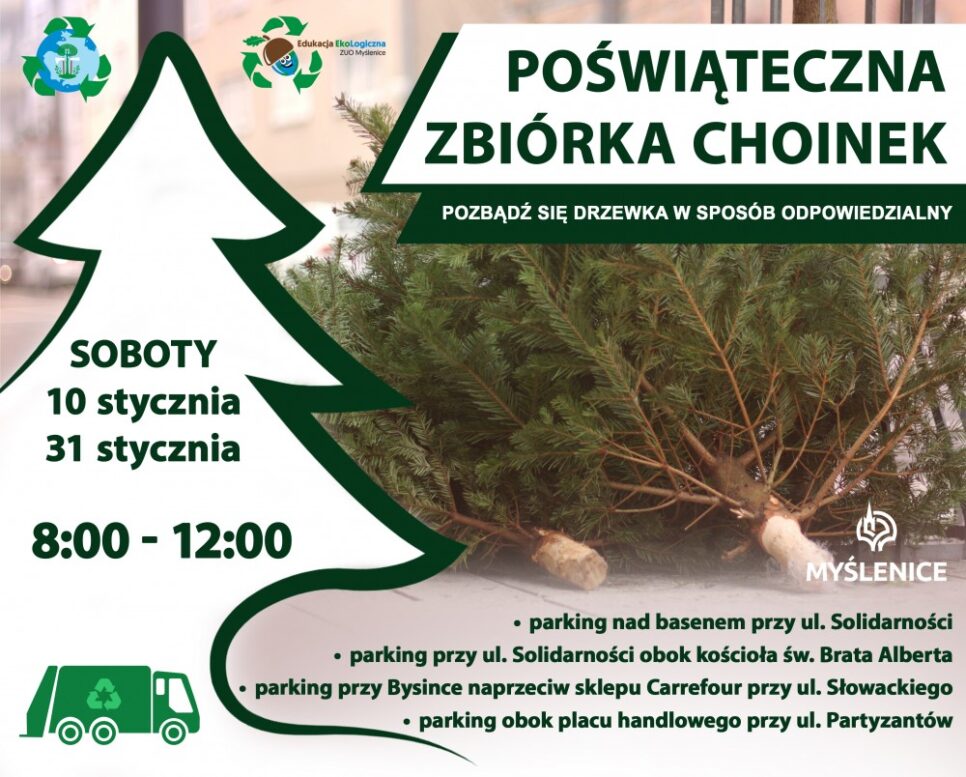 Po okresie świątecznym w Myślenicach ponownie zostanie zorganizowana zbiórka naturalnych choinek. Zakład Utylizacji Odpadów zapowiada, że mieszkańcy będą mogli oddać swoje drzewka bez żadnych opłat. Specjalne kontenery pojawią się w mieście w dwie soboty – 10 oraz 31 stycznia 2026 roku, w godzinach od 8.00 do 12.00. Zostaną ustawione m.in. w rejonie parkingu nad basenem przy ulicy Solidarności, w pobliżu kościoła św. Brata Alberta, przy Bysince naprzeciw sklepu Carrefour na Słowackiego oraz obok placu handlowego przy Partyzantów.