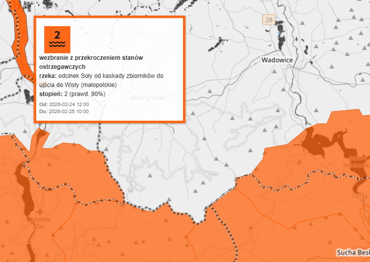 Sytuacja skłoniła Instytut Meteorologii i Gospodarki Wodnej do wydania ostrzeżenia hydrologicznego pierwszego stopnia. Alert obejmuje zlewnie Soły, Skawy, Rudawy, Raby, Dunajca oraz Czarnej Orawy i obowiązuje do wtorku, 24 lutego, do godziny 10.00. Prawdopodobieństwo wystąpienia prognozowanych zjawisk oceniono na 80 procent.