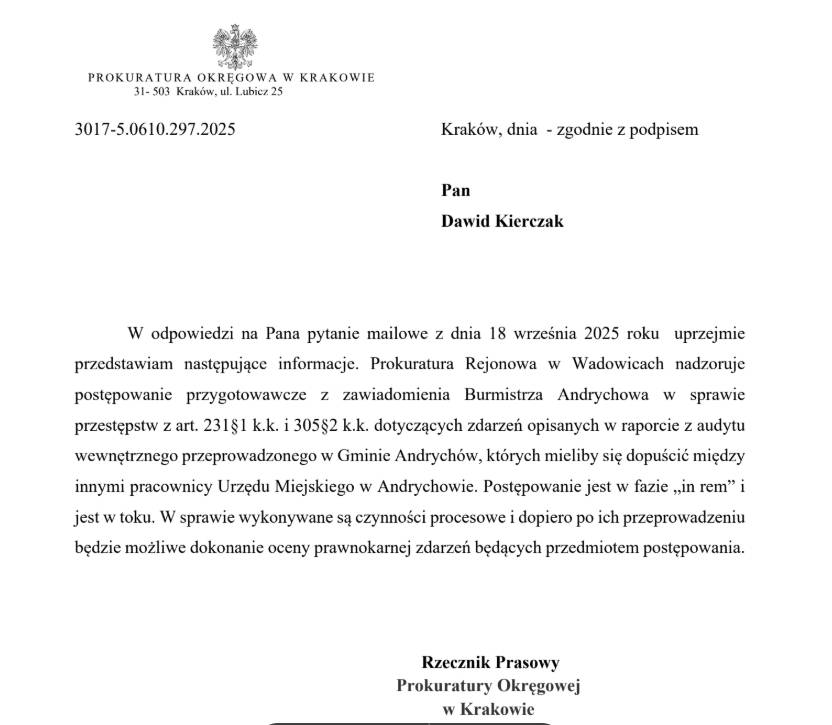 Formalnie śledztwo toczy się dalej, lecz w fazie in rem, czyli bez wskazania konkretnych osób jako podejrzanych. Oznacza to, że prokuratura bada, czy w ogóle doszło do przestępstwa, a jeśli tak – kto miałby za nie odpowiadać. Chodzi o potencjalne naruszenia z art. 231 kodeksu karnego (nadużycie władzy przez urzędnika) oraz art. 305 (nielegalny wpływ na przetargi). To jednak odrębne wątki, które nie znalazły dotąd potwierdzenia w faktach.