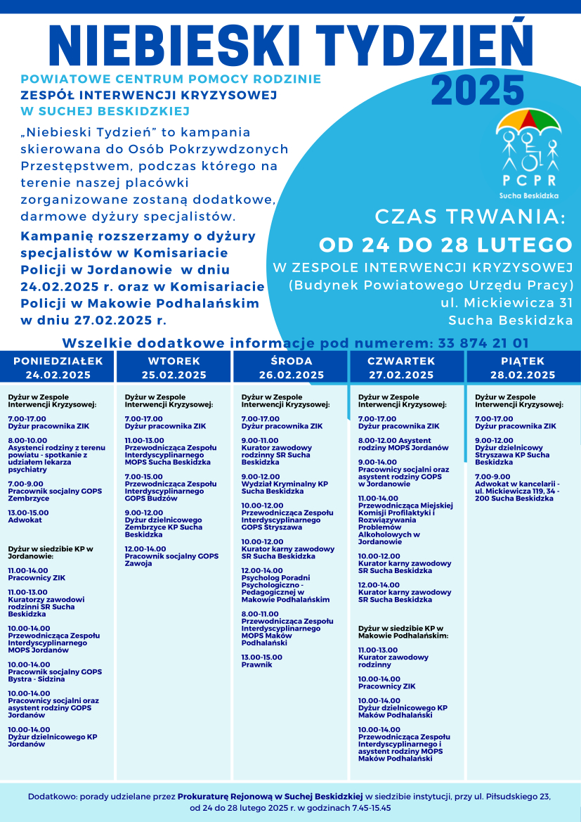 Podczas „Niebieskiego Tygodnia” specjaliści będą dostępni w różnych godzinach, umożliwiając pokrzywdzonym znalezienie dogodnego terminu na skorzystanie z porad. W harmonogramie uwzględniono obecność m.in.: