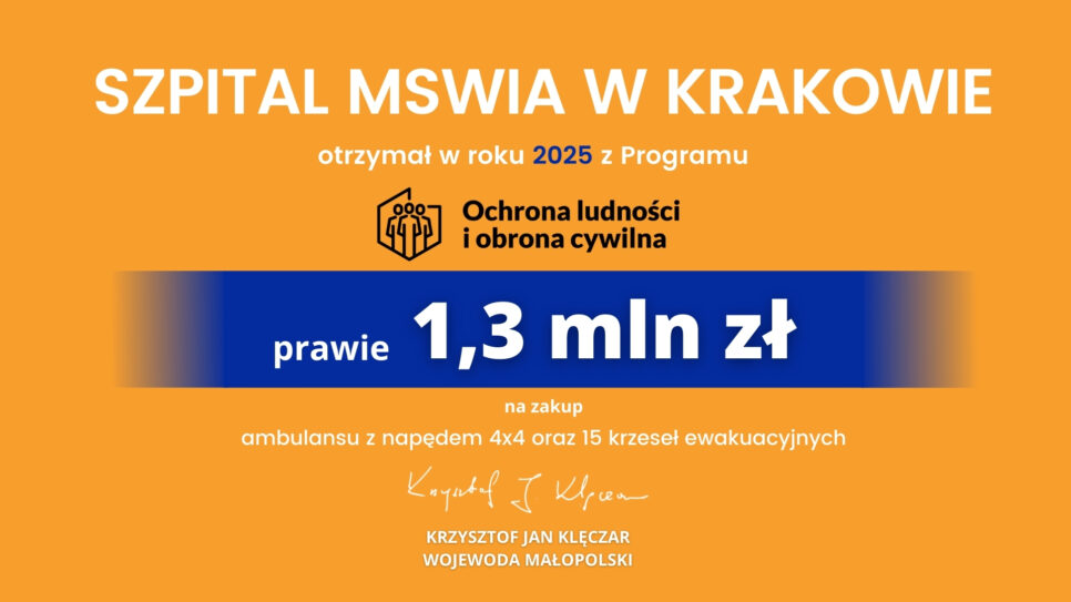 Samodzielny Publiczny Zakład Opieki Zdrowotnej MSWiA w Krakowie wzbogacił się o nowy sprzęt medyczny — zakupiono karetkę z napędem 4×4 oraz 15 krzeseł ewakuacyjnych. Zakup sfinansowano ze środków Programu Ochrony Ludności i Obrony Cywilnej.