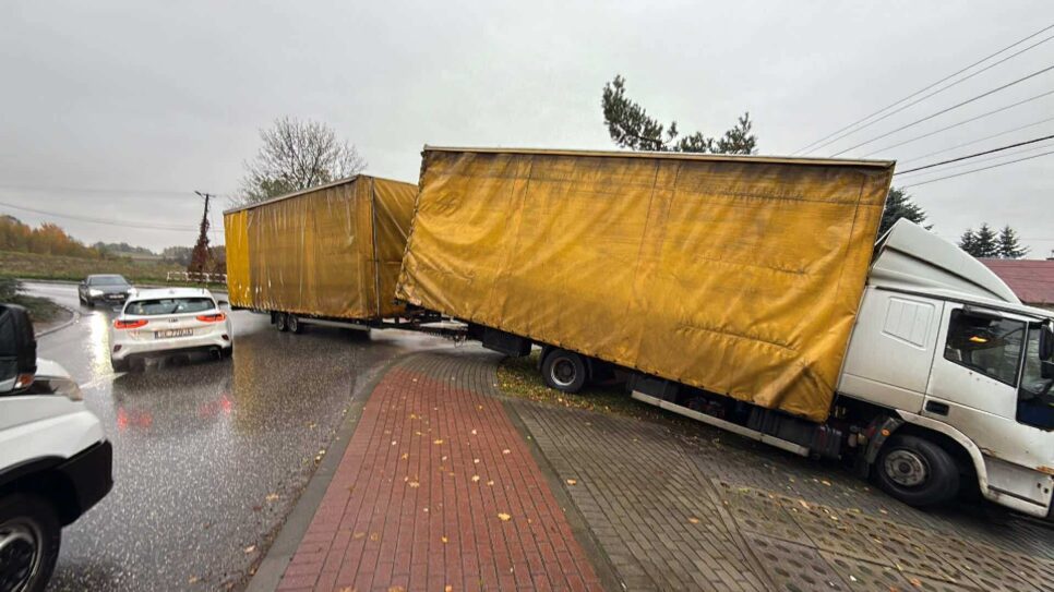 Poranek na drogach regionu nie należał do spokojnych. W Witanowicach (gmina Tomice), na dobrze znanym kierowcom łuku obok zakładu Smolbet, kierujący zestawem z przyczepą stracił panowanie nad pojazdem i wypadł z trasy, kończąc na ogrodzeniu posesji. Nikomu nic się nie stało, jednak uszkodzony płot i rozjechana skarpa pokazują, jak niewiele trzeba, by duży zestaw “poszedł bokiem” na serpentynach.