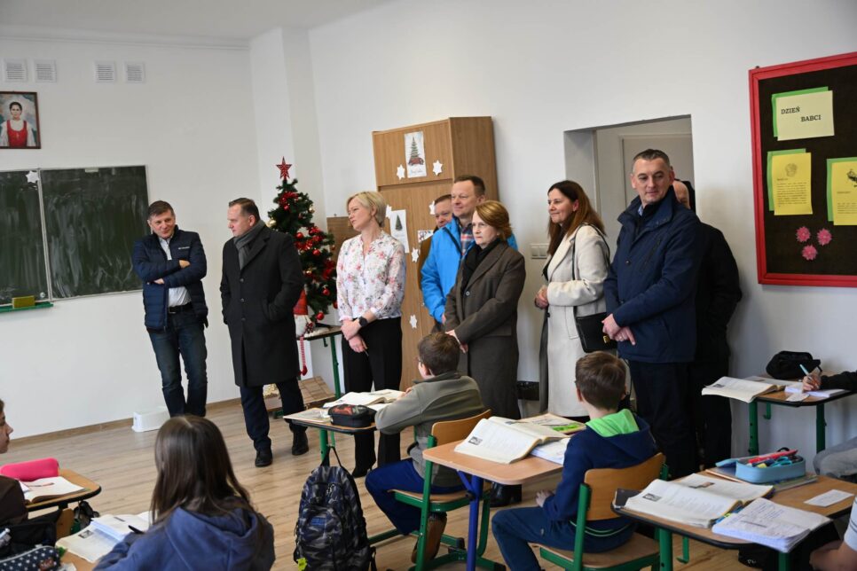 Wójt przedstawił zakres i przebieg prac, a dyrektor szkoły oprowadziła gości po odnowionych pomieszczeniach. W trakcie wizyty wykonawca i inspektor odpowiadali na pytania dotyczące zastosowanych rozwiązań technicznych.