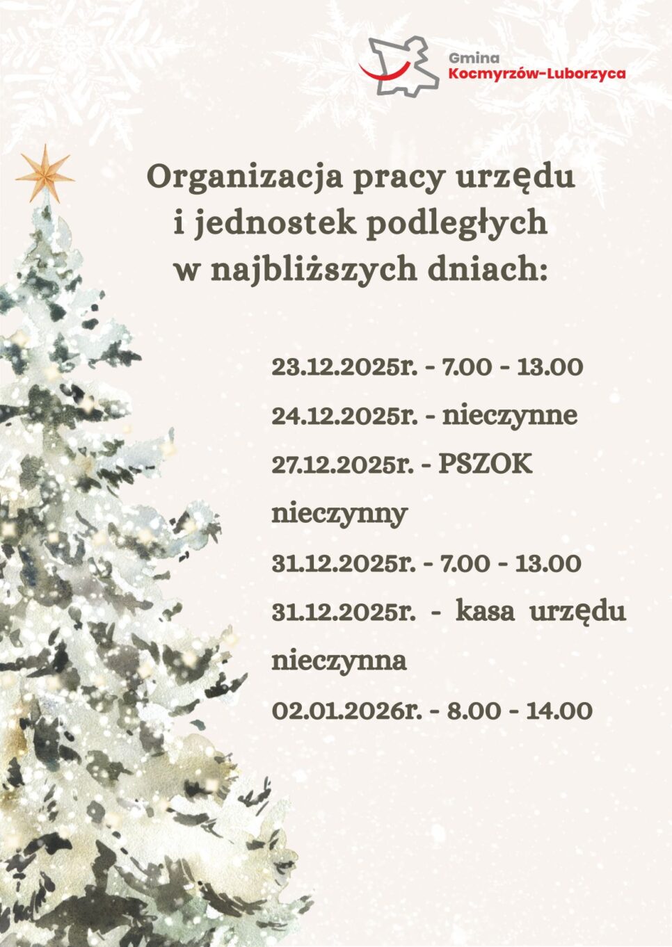 - 23.12.2025 — Urząd Gminy będzie czynny w godzinach 7:00–13:00.