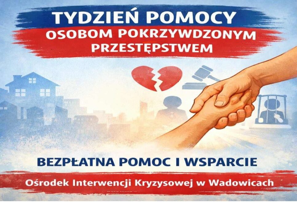 Ośrodek Interwencji Kryzysowej w Wadowicach przystępuje do ogólnopolskiej kampanii „Tydzień Pomocy Osobom Pokrzywdzonym Przestępstwem”, która w 2026 roku odbywa się w dniach 16–22 lutego. Inicjatywa realizowana jest wspólnie z Komendą Powiatową Policji w Wadowicach oraz Sądem Rejonowym w Wadowicach.