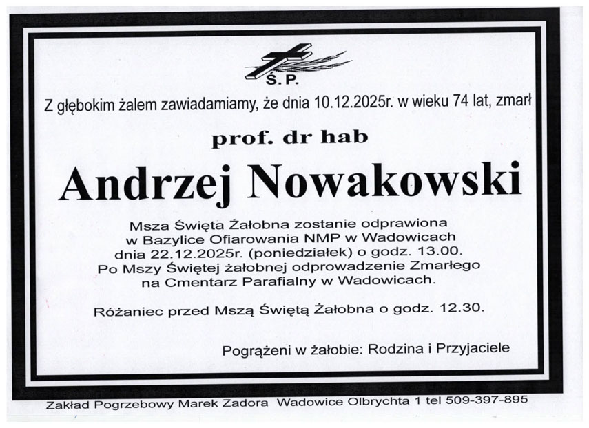 Wadowice przygotowują się do pożegnania jednej z najważniejszych postaci związanych z historią i tożsamością miasta. Znamy już datę i miejsce pogrzebu Andrzej Nowakowski, wybitnego regionalisty, historyka, miłośnika kolei i autora setek publikacji naukowych oraz popularnonaukowych. Naukowiec zmarł ponad tydzień temu w Rzeszowie, w wieku 74 lat.